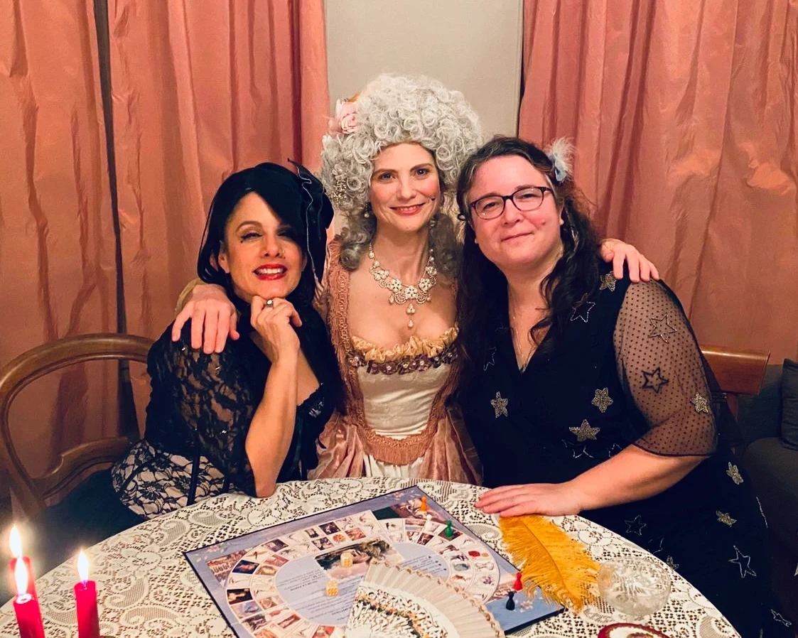 L’appartement était élégant et intemporel, ce qui nous a bien aidées avec la transformation de chaque pièce en écrin approprié pour nos voyageurs temporels. La cuisine, avec son carrelage magnifique et ses placards en bois sombre, accueillerait parfaitement Legs Diamond, notre gangster de la prohibition. Le salon élégant, sa table ancienne et sa cheminée en marbre, serait à la hauteur de l’élégante Marie-Antoinette. Et la chambre, avec son lit accueillant et ses murs blancs pour y projeter nos lumières étoilées, deviendrait la demeure bohème de notre Femme à Barbe diseuse de bonne aventure.
