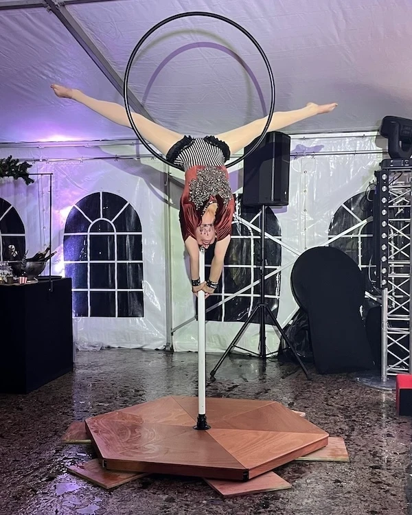 Manon David, qui jouait Clémentine Delait, notre femme à barbe aux pouvoirs clairvoyants, était installée dans le showroom salle de bain pour faire un numéro burlesque et une animation de lecture de cartes de tarot en continu. Christie Chery, notre femme la plus forte du monde, Lady Hercules, était dans la boutique pour animer des compétitions de force avec les mecs machos du bâtiment. Lila Chupahoops, qui jouait la dompteuse Priscilla Kayes, a fait une animation d’apprentissage d’utilisation des cerceaux et du fouet artistique dans le Barnum. Kirby Marzelle, l’acrobate extraordinaire, a fait 3 numéros sur sa Lyra, un cerceau sur tige propice aux figures d’acrobatie aérienne. Elena était quant à elle notre Madame Loyale, Kitty Stark, et a fait aussi un numéro d’effeuillage burlesque clownesque. Chacune a fait un numéro sur le thème de son personnage pour mettre en valeur à la fois leur rôle et l’artiste.